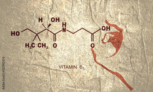 Hand holding chemical molecular formula of vitamin B5 pantothenic acid.