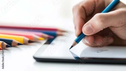 Hand Holding Colored Pencil Drawing on Digital Tablet Surface