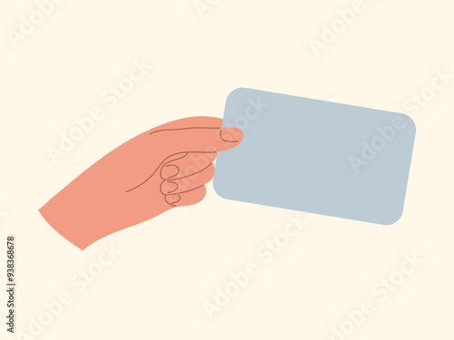 Hand holding empty Card Flyer Voucher Certificate Coupon. Shopping Purchase payment concept. Blank credit card in humah hand