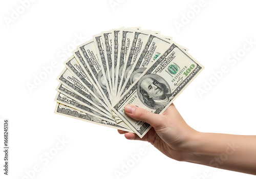 Hand holding fan of us dollar bills for financial success and wealth accumulation