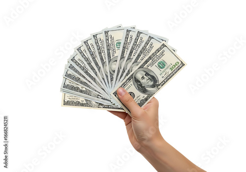Hand holding fan of us dollar bills showing wealth and financial prosperity