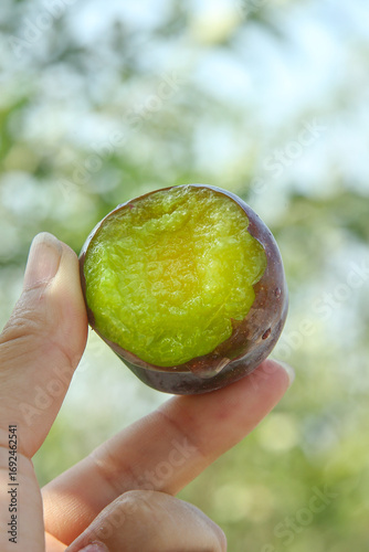 Hand Holding Fresh Green Plum with Sweet Crunchy Flesh Against Natural Background