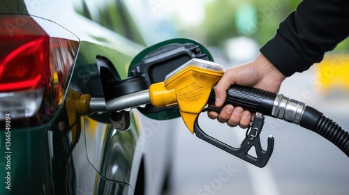 Hand Holding Fuel Pump Nozzle at Gas Station Filling Vehicle with Gasoline in Urban Environment