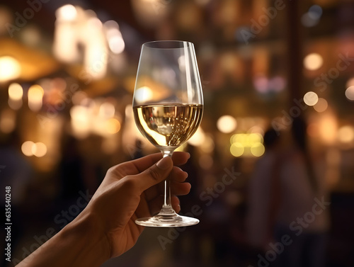 Hand holding glass of white wine , people cheering, cheers, spending a moment together with friends, party, happy moment, wine tasting, cheering, family