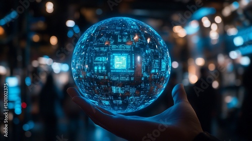 Hand holding glowing crystal sphere with digital data in blurred city background
