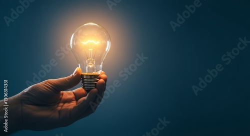 Hand holding glowing light bulb against dark background. Innovation concept, creative idea symbol. Inspiration and problem-solving visualization. Energy efficiency metaphor.