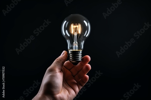 Hand holding glowing light bulb in dark with space for text, creativity and innovation concept