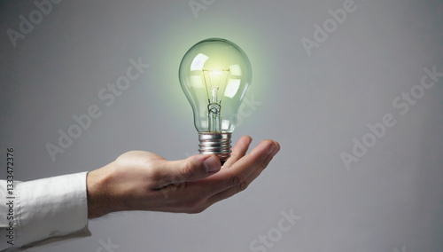 hand holding glowing light bulb symbolizing bright idea, with close up focus on bulb against neutral background