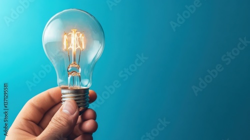 Hand holding illuminated light bulb against blue background