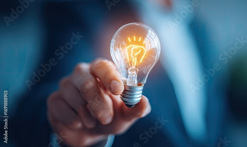 Hand holding incandescent lightbulb with glowing filament and question mark symbol