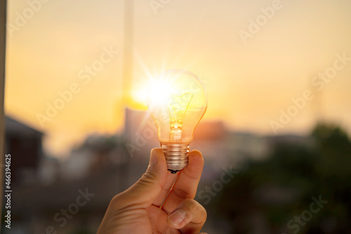 Hand holding light bulb against nature on green leaf with energy sources for renewable