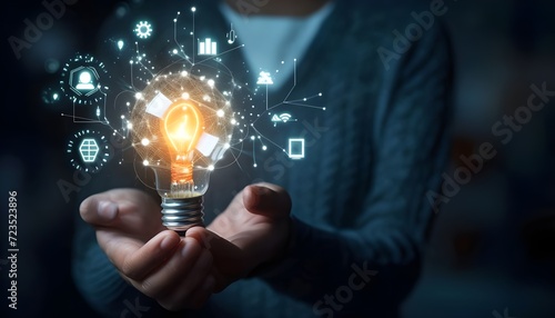 Hand holding light bulb and business digital marketing innovation technology icons on network