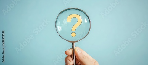 Hand holding magnifying glass focusing on a large question mark against a light blue background symbolizing inquiry and curiosity