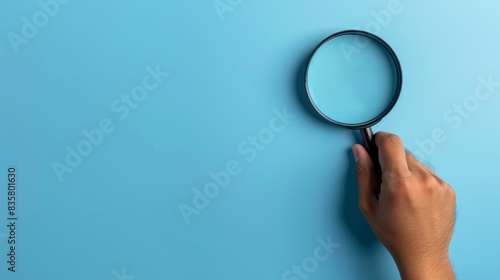 Hand holding magnifying glass on blue background. Search, research, or details concept. Close-up, minimalistic style, focus on magnifying glass.