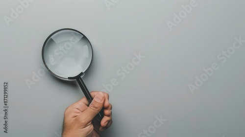 Hand holding magnifying glass on isolated light grey background. Generative AI