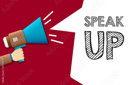 Hand holding megaphone with Speak Up text. Hand holding megaphone with open space for your text.