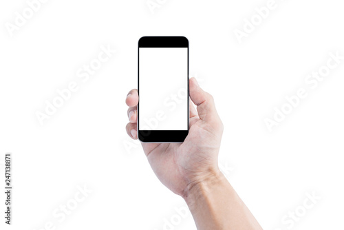 Hand holding mobile smart phone, blank white screen isolated on white background. Clipping path include