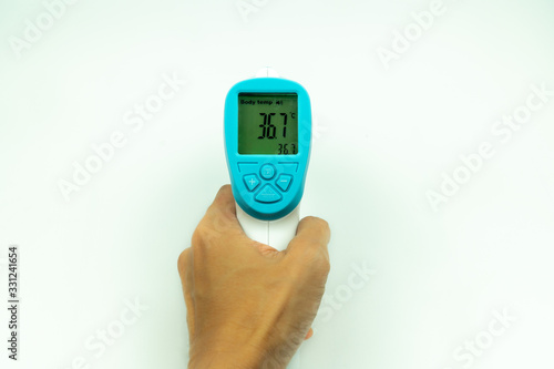 Hand holding non-contact infrared thermometer isolated on white background to measure a body temperature.