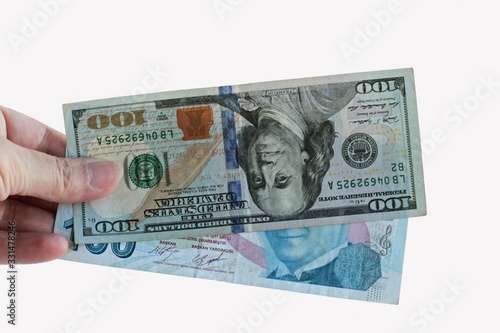 Hand Holding One Hundred American Dollar and Turkish Lira.Isolated on white,close up taken.