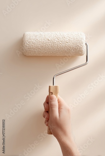 Hand Holding Paint Roller Ready to Apply Fresh Coat of Paint on Smooth Beige Wall Surface