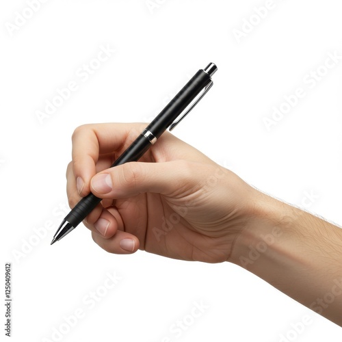 Hand holding pen, writing gesture, close-up, white background, sleek black pen, precision tool, minimalist composition, studio lighting, isolated arm