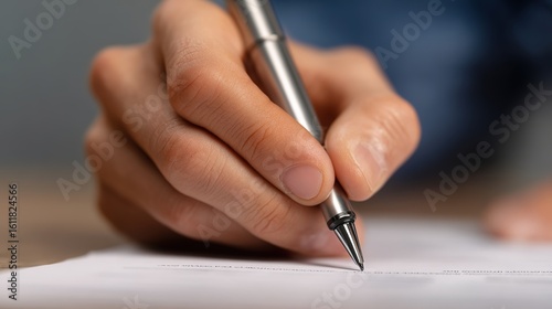 Hand Holding Pen Writing on Paper Close Up Office Setting