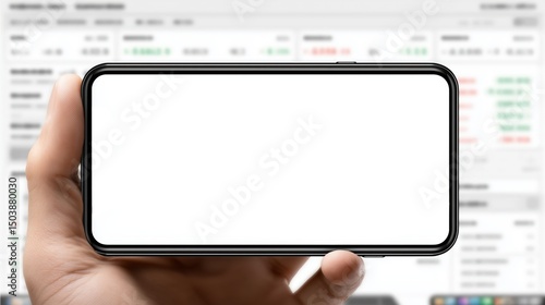 hand holding phone with blank white screen. stock charts Currency on large monitor background, clean lighting