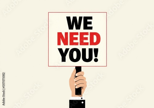 Hand holding sign, bold text " WE NEED YOU! ", red and black typography, white background, recruitment poster style, minimalist design, vector illustration