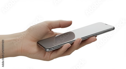 Hand Holding Silver Smartphone with Blank Screen on White Background