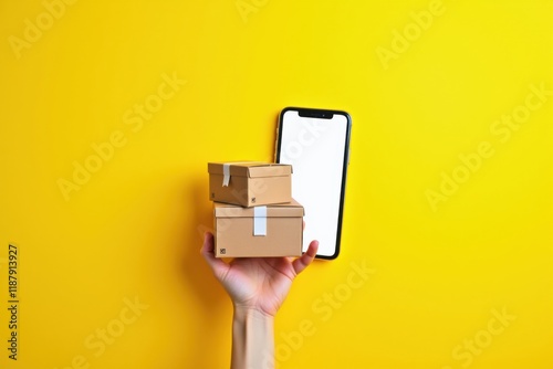 Hand holding small delivery boxes and a smartphone with a blank screen against a vibrant yellow background. Perfect for e-commerce, online shopping, delivery, or logistics themes.