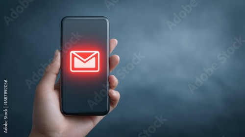 Hand Holding Smartphone Displaying Illuminated Email Icon Against Dark Background, Symbolizing Digital Communication and Modern Technology
