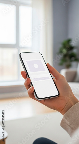 Hand Holding Smartphone with Blank Screen in a Home Setting