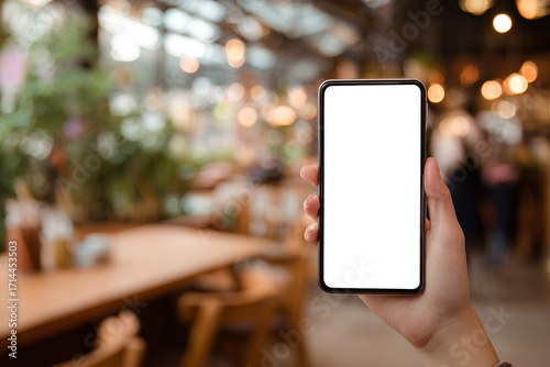 Hand holding smartphone with blank screen in cozy cafe, mobile mockup