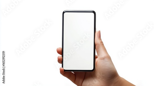 Hand Holding Smartphone with Blank White Screen Against White Background