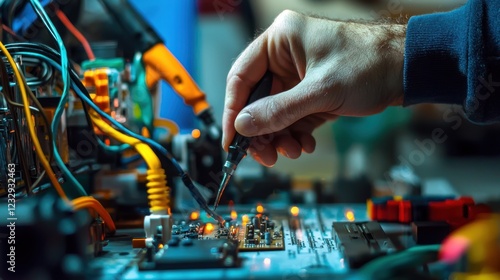 Hand Holding Soldering Iron Working on Circuit Board in Workshop