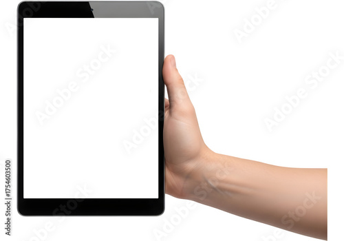 Hand Holding Tablet with Blank White Screen for App Mockup, Advertising, Presentation on Black Background
