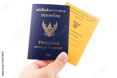 Hand holding Thailand official passport and vaccine passport are on isolated white background with a clipping path.