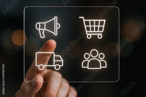 Hand holding transparent digital screen with icons for marketing shopping and logistics management.