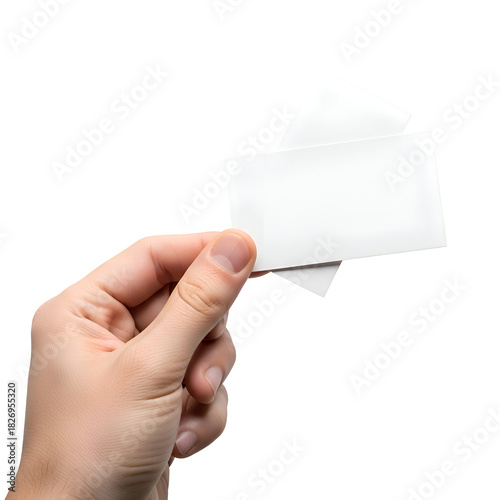 Hand holding two blank white business cards against black background image