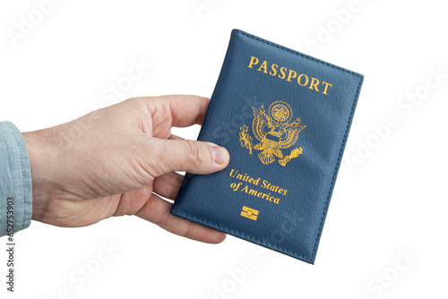 hand holding U.S. passport isolated on White Background. issuance an American passport, obtaining US citizenship