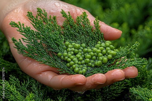 Hand holding vibrant green plant sprig with small, round, unripe berries.