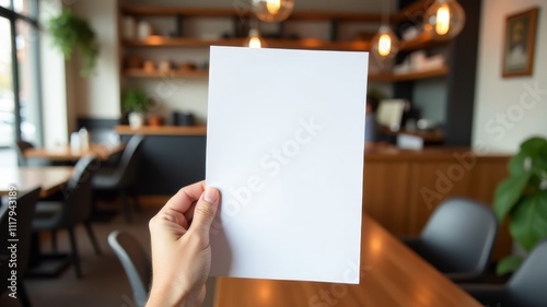 Hand holding white A4 sheet prepared for text in coffee shop.