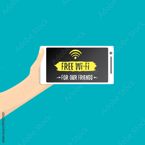 Hand holding white smart phone with free wi-fi sign on touch screen isolated on azure background. Vector flat style design phone with screen and human hand. Free wi-fi concept
