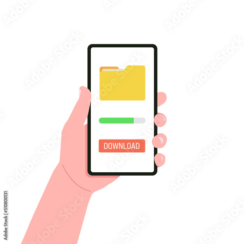 Hand holds a mobile phone. The loading process on the smartphone screen. Vector.