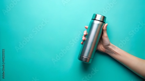 Hand holds a silver thermos bottle