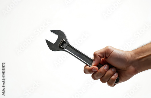 Hand holds adjustable wrench tool. Mechanic instrument on white background. Spanner in engineer hand, repair concept. Chrome metal tool for construction, repair, service.