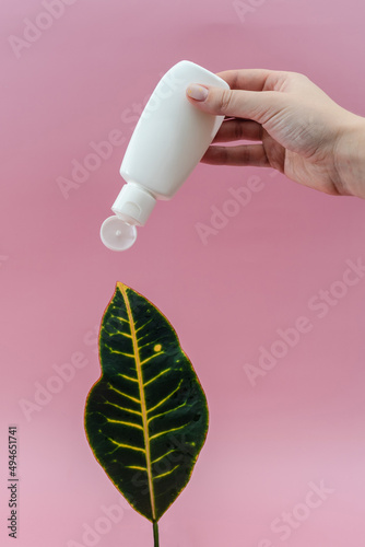 Hand holds and squeezes tube of cream (gel) above green leaf on pink background