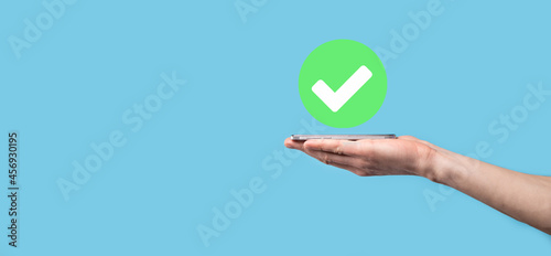 Hand holds green icon Check mark,Check Mark Sign, Tick Icon,right sign,circle green checkmark button,Done.On dark background.Banner.Copy space.Place for text.