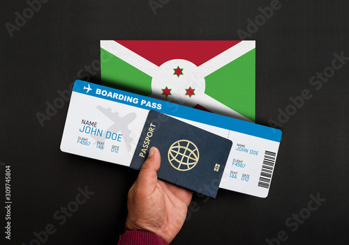 Hand holds passport and boarding pass with flag of Burundi