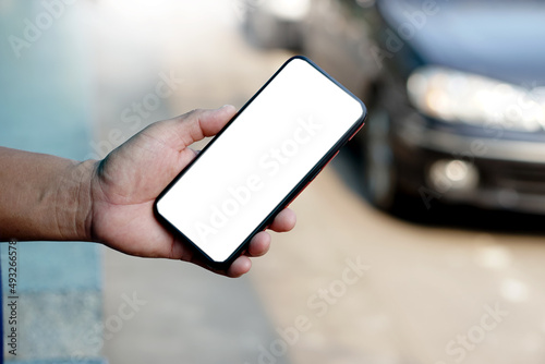 Hand holds white blank screen smartphone. Blurred car background. Concept: Using mobile internet applications on smartphone for car service, transportation technology.